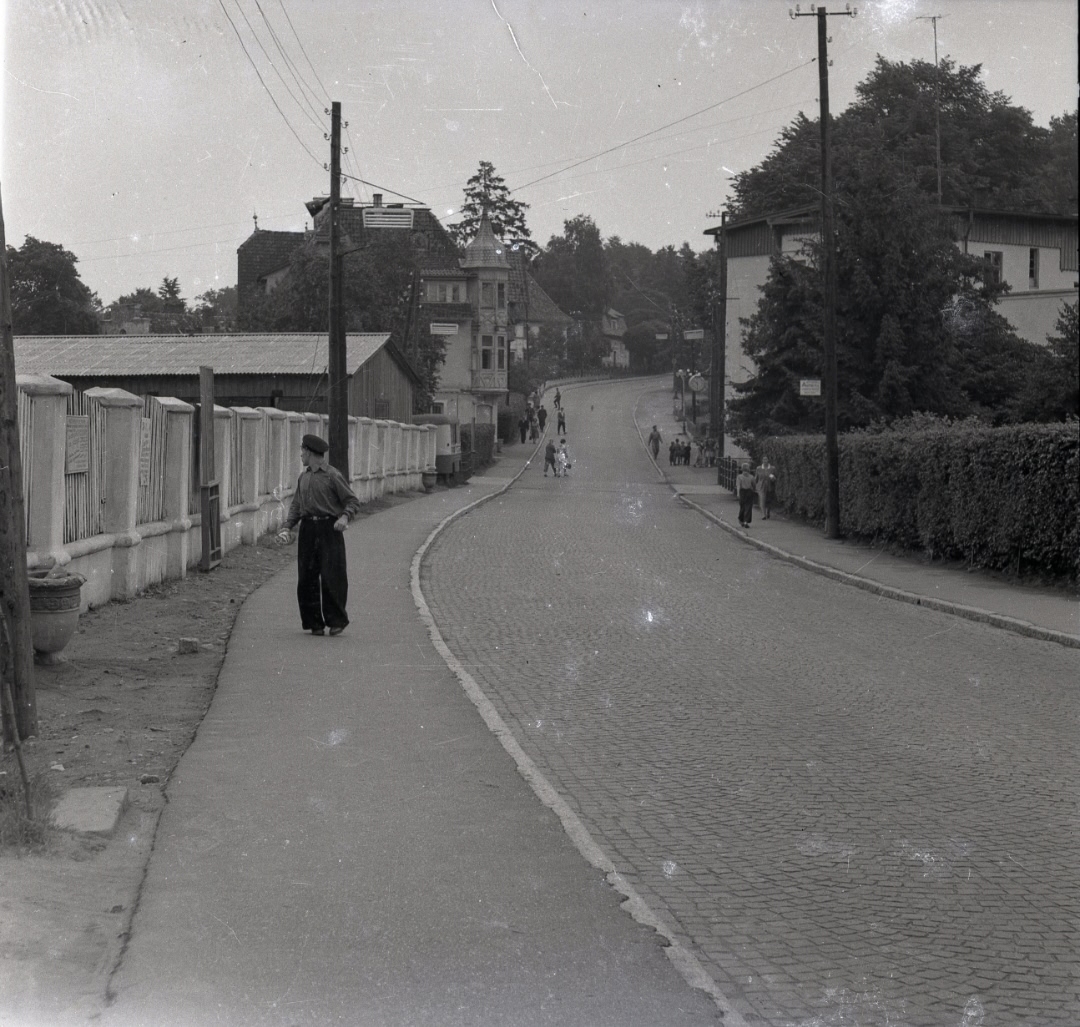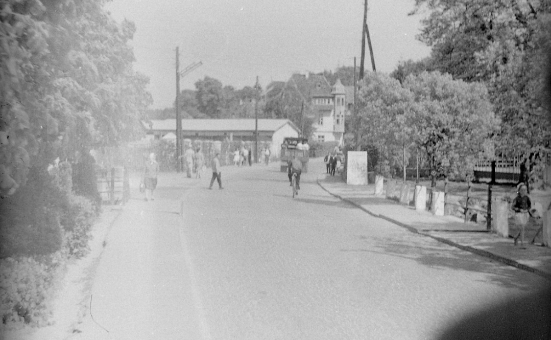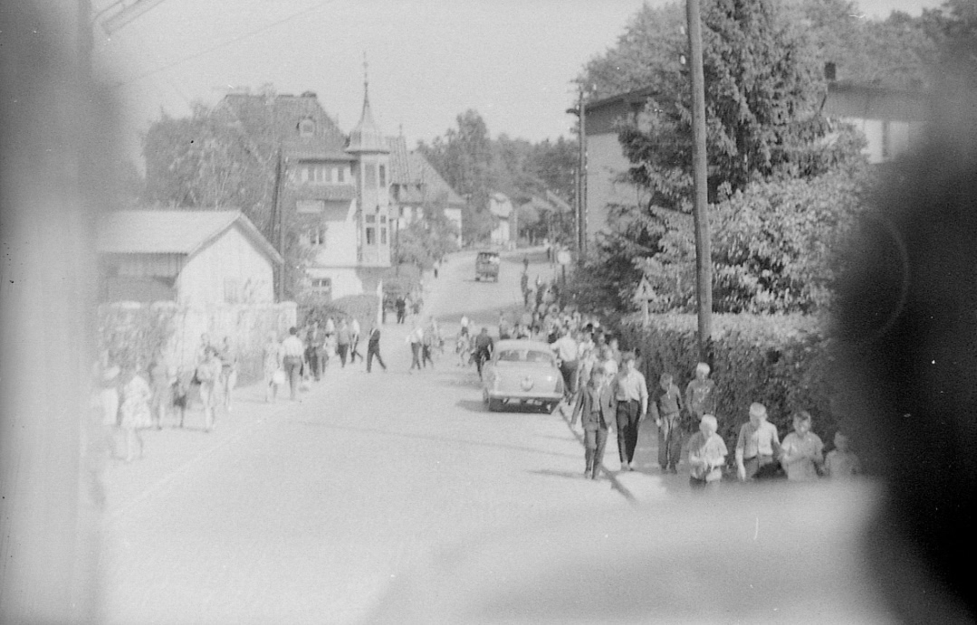 А вот то же место (фото 3), но мы видим большой поток людей, идущих в сторону озера и в курортную часть . Это пассажиры поезда, прибывшие на станцию Светлогорск 1. (Стоит вспомнить, что до станции Светлогорск 2 рельсы будут восстановлены и поезд пойдет только к 1968 году). Поэтому у студентов,у работающих в Калининграде и отдыхающих маршрут до станции и обратно проходил по лесной пешеходной дорожке.