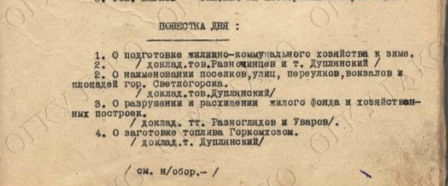 В Госархиве КО сохранился Протокол заседания Исполнительного Комитета Светлогорского городского Совета депутатов трудящихся от 01 октября 1947 года о переименовании улиц и поселков.